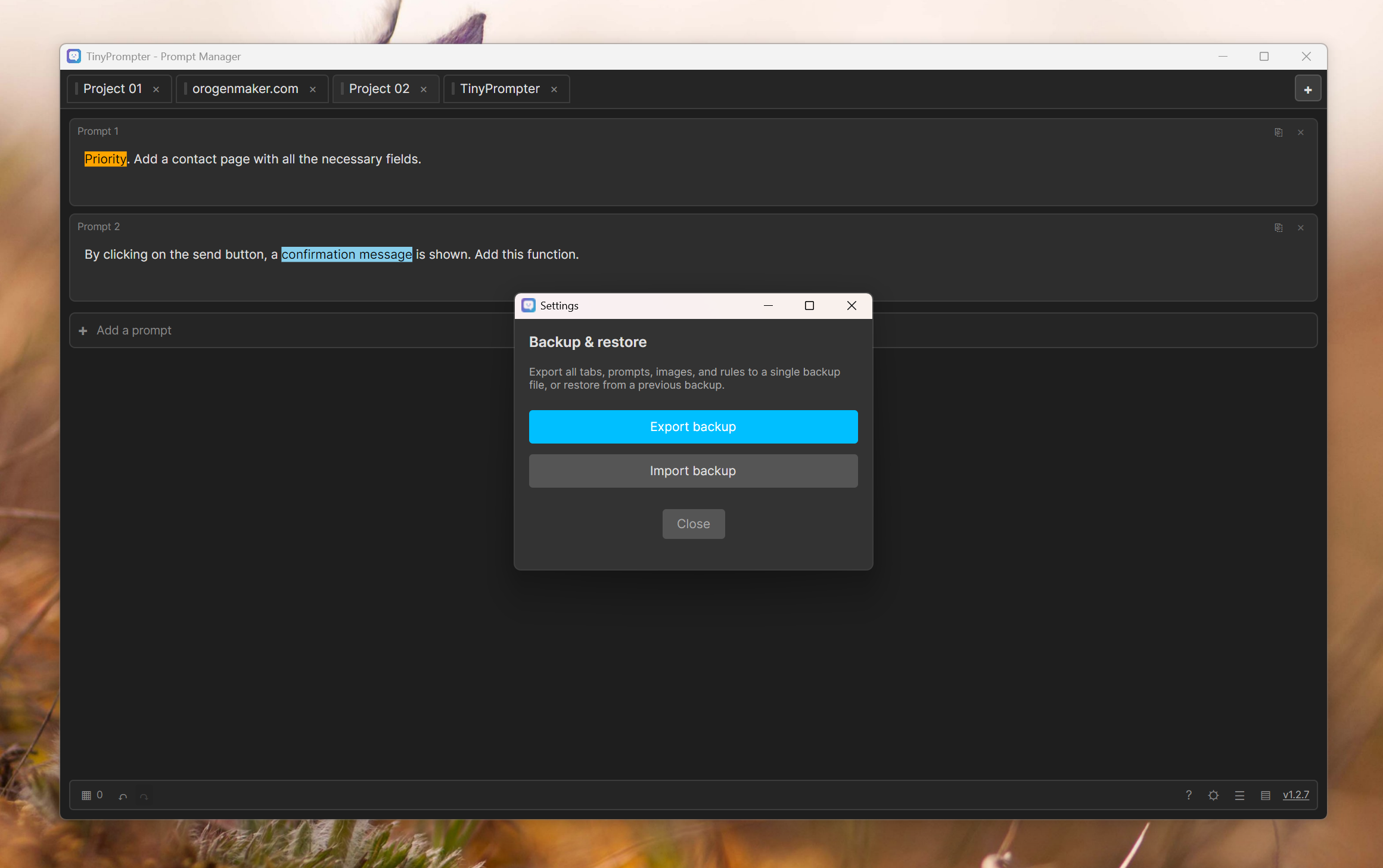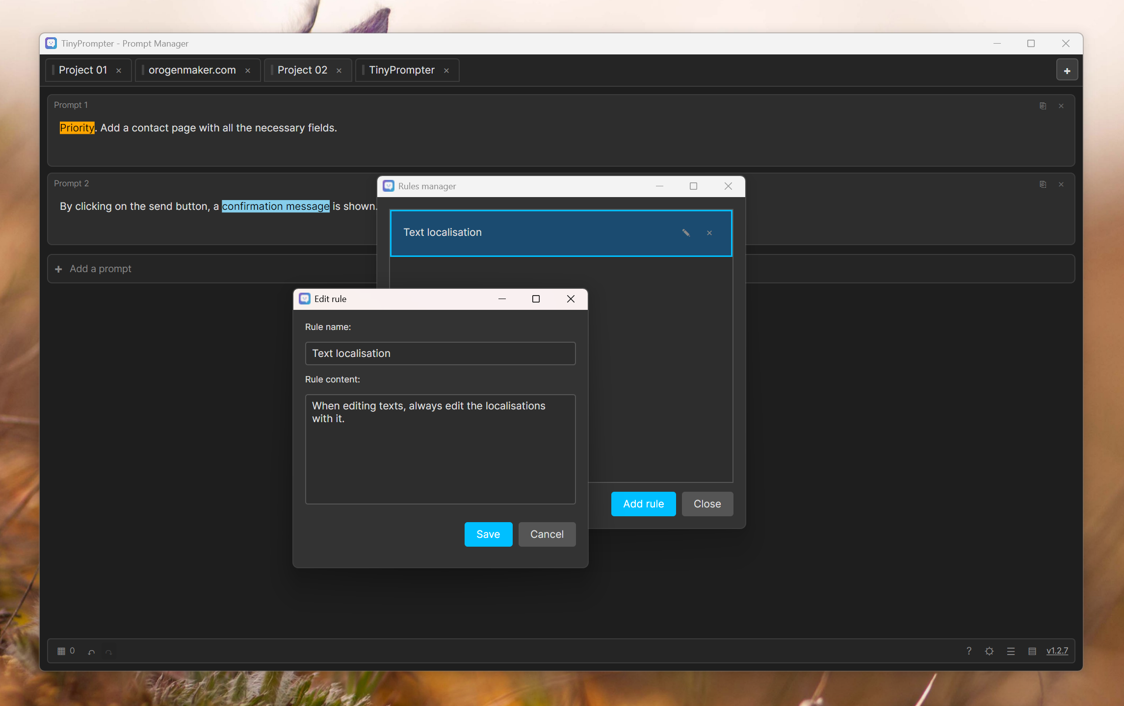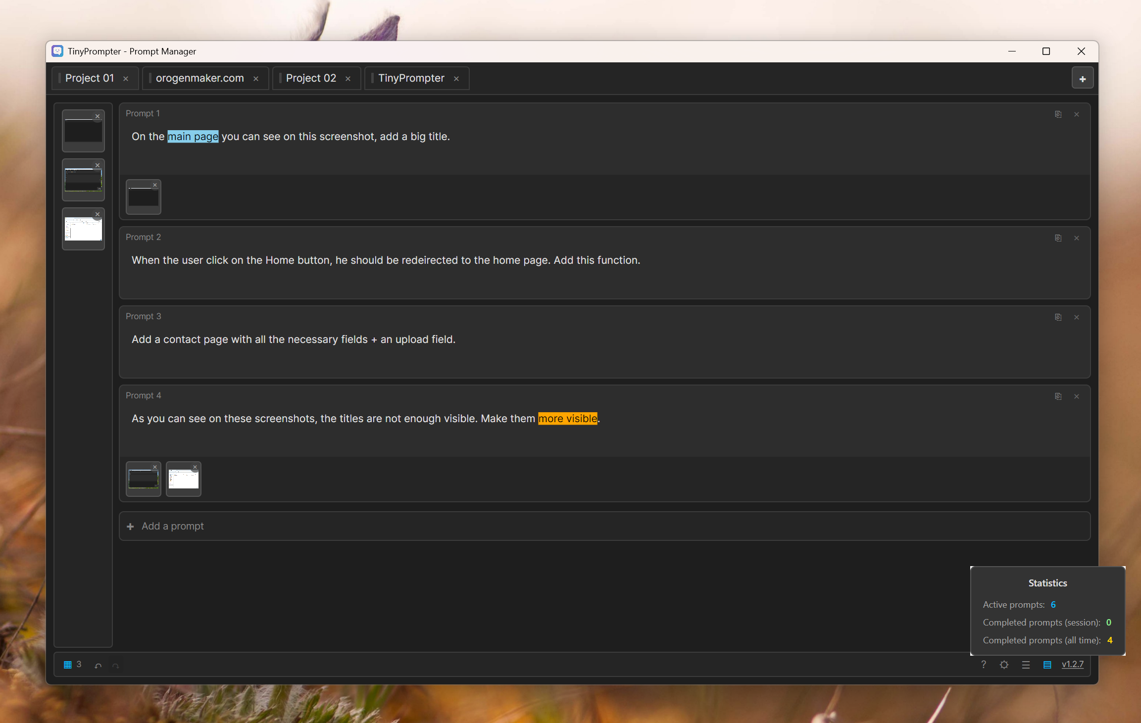 TinyPrompter is a Windows prompt manager designed to optimize your productivity with artificial intelligence. Whether you use ChatGPT, Claude, Gemini, or any other AI assistant, TinyPrompter allows you to organize, save, and easily find all your prompts. Classify your prompts by projects in dedicated tabs, add custom rules to your prompts, set priorities, and track your usage statistics.
