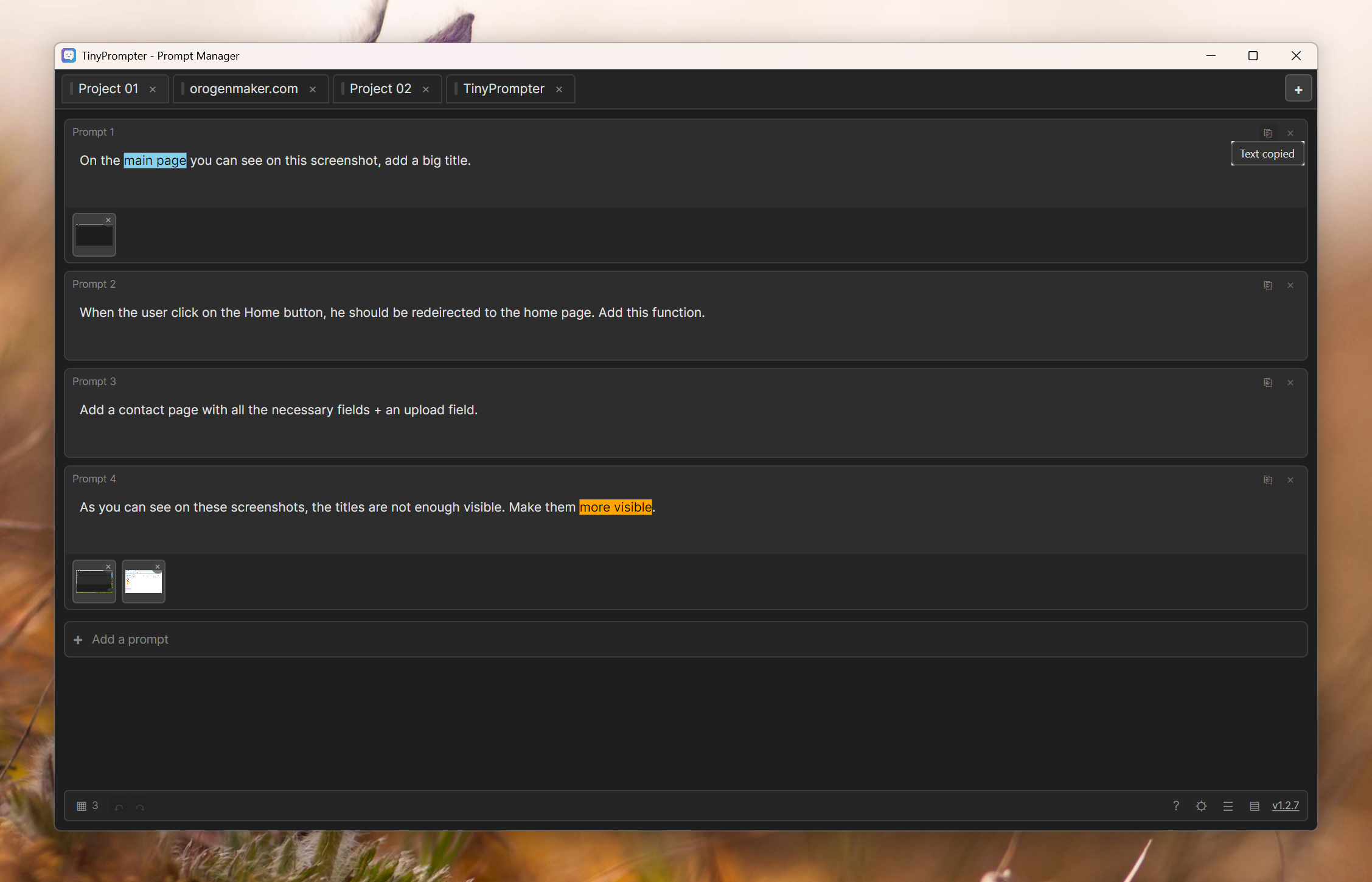 Write your prompts comfortably with an editor designed for productivity, with the ability to color your text for better instruction structure. Easily add and manipulate screenshots to enrich the context of your prompts. Designed as a perfect blend of notepad and task list, TinyPrompter adapts to all workflows. Whether you're a developer, writer, researcher, or simply an AI enthusiast, TinyPrompter is the essential tool for getting the most out of your interactions with artificial intelligence.